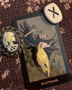 James Ricklef points to “the numerological meaning of the number Ten as “endings that lead to new beginnings” and the Swords suit association with thoughts, beliefs, and ideas. Thus, as he quite rightly says “this card can say that we need to let go of old concepts and ideas in order to embrace new ones. It can herald the realization that some things cannot be explained or understood; they have to be taken on faith. And it may say that after reason has been exhausted, we will find the value of our intuition”.