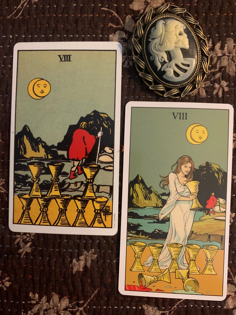 In the classic Rider Waite Eight of Cups, a man walks away from the eight cups standing in the foreground. The cups are arranged in such a way that it looks like one is missing, a sign that emotional fulfillment and wholeness is lacking. The man has turned his back on these cups with a sense of loss and disappointment and shuffles away into the mountains. A nearby river symbolizes his emotions, and the mountains represent the awareness that this will not be an easy journey (though it will be necessary for true long-term happiness). The moon in the night’s sky illuminates the path ahead – the man is leaving in the dead of night hoping to go unnoticed, suggesting that there may be a level of escape or avoidance in this card.