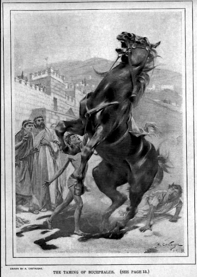 Perhaps my fondest memory of growing up in the company of Alexander was of the idyllic hours we spent in the palaestra exercising and swimming in a large swimming pool. I was with Alexander when he tamed a wild horse named Bucephalus. We prized horses and Bucephalus was an impressive animal with impeccable breeding. He hailed from the “best Thessalian strain” of horses. When he arrived he was a wild spirited, unmanageable, massive, black coated creature with a large white star on his massive forehead. Because he was both vicious and unmanageable and would not allow anyone to mount him King Phillip wasn’t interested in him. It was Alexander who, still only a boy of thirteen, took up the challenge and won the heart of the fiery stallion. Bucephalus, perhaps one of the most famous horses in history, faithfully served him in many battles until his death at the Battle of the Hydaspes.