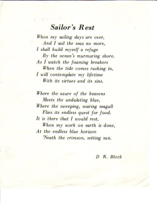 However, the beautifully impressive service of the Church of England is read at the funeral of sea burial: thus we part company from all that is left of our former colleagues, who pass on to their well earned rest, leaving us on earth to work out the remainder of our present destiny therein.