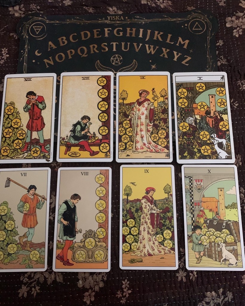 Of course, what is not always mentioned in these success stories is that the kind of success depicted in the Ten of Pentacles doesn’t usually appear overnight. Such success comes after the vision, hard work, resilience, responsibility and reliability associated with the Seven and Eight of Pentacles in particular.