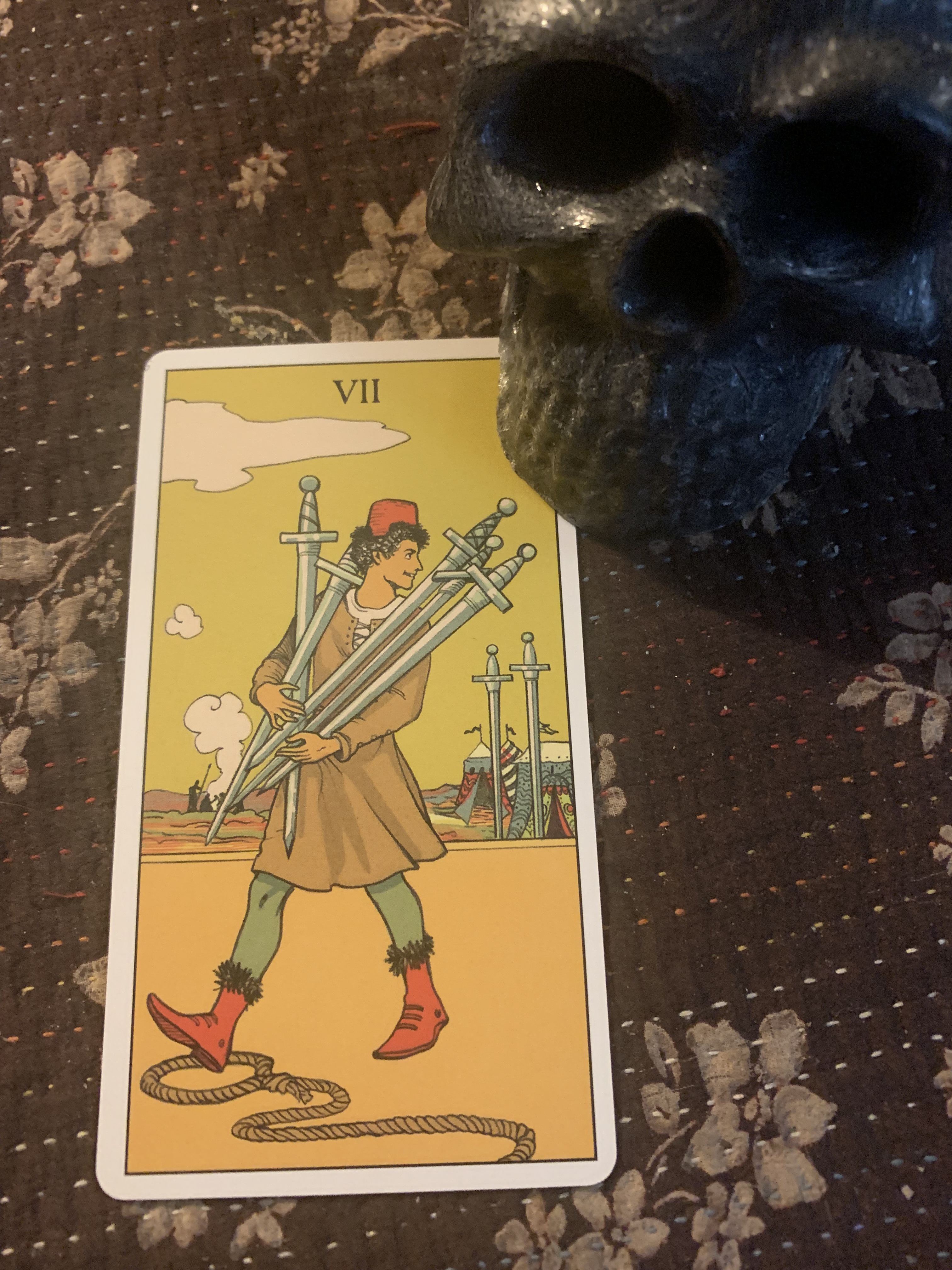 The Seven of Swords shows a man sneaking away from a military camp with five swords in his arms. He looks over his shoulder at the two upright swords he has left behind. The smile on his face suggests that he is proud of himself for having slipped away without being noticed.