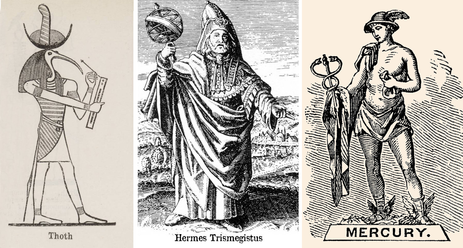 Hermes in Greek (or Mercury in Roman) mythology, the messenger god on Mount Olympus, had a magic wand called a Caduceus, which was given to him by Apollo. The Caduceus symbolizes the spinal column, the central conduit for the Psychic Force, or nerve energy, which animates all the organs and members of the body. Hermes/Mercury is associated with the Magician card in the Tarot.